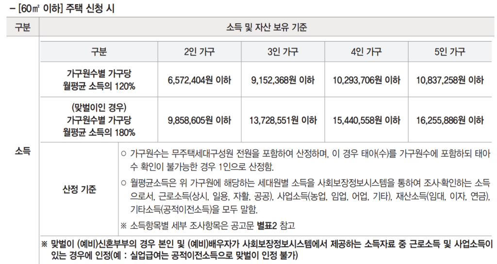 - 전용 60㎡ 이하: 3인 가구 맞벌이 기준 월 1,372만 원까지 가능.