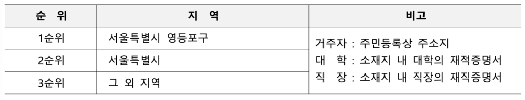 동일 소득일 경우에는 아래 지역 순위 기준을 적용하여 당첨자를 선정합니다.