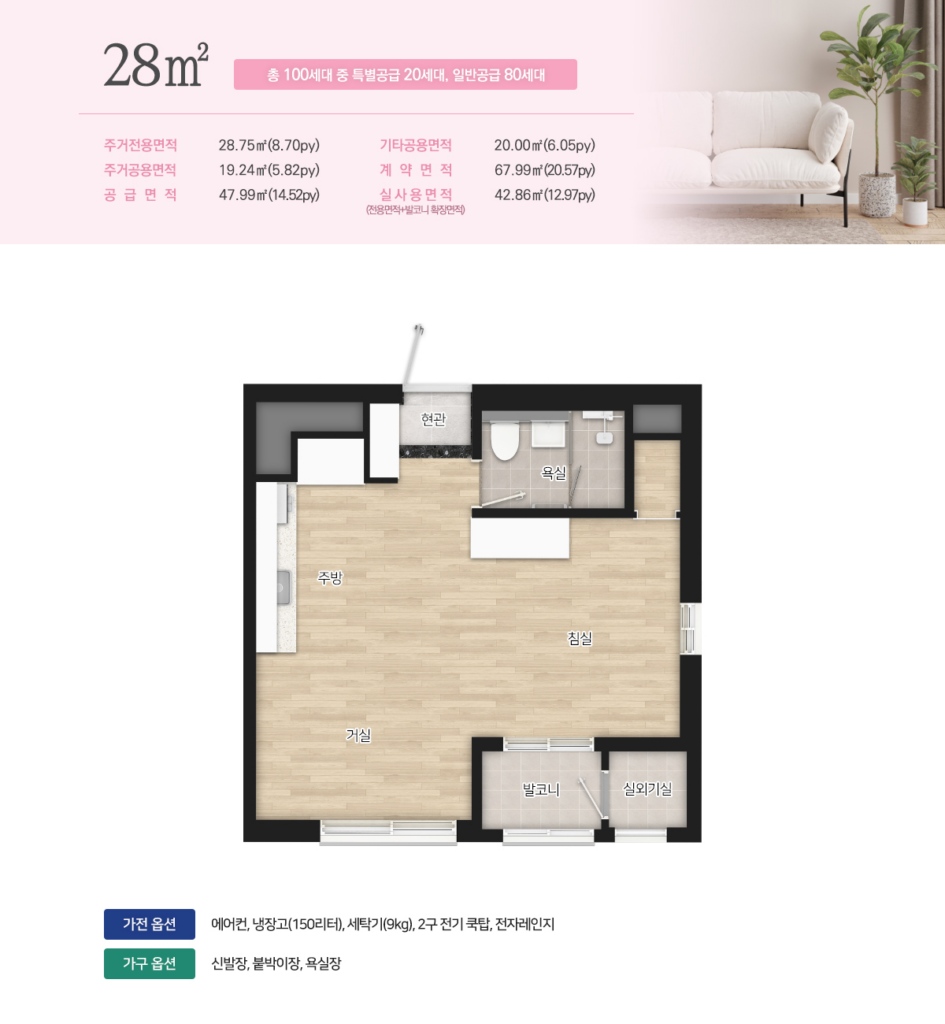 - 28형은 발코니가 포함된 넓은 원룸 형태입니다. 방이 분리되어 있지는 않지만 침실 공간을 분리해서 사용할 수도 있겠네요.